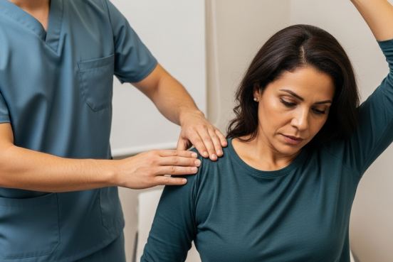O diagnóstico da bursite começa pela avaliação clínica e funcional. Durante a consulta, observo quais movimentos provocam dor, como está a mobilidade do ombro e se há sinais de impacto ou sobrecarga associada.